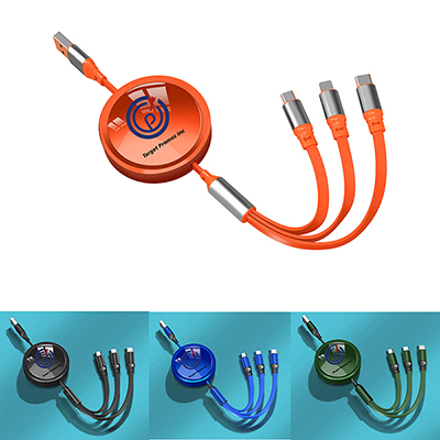 This retractable USB charger cable features three charging cords for Type C, phone, and Micro USB devices. Perfect for use with cell phones, tablets, and more. With its retractable design, this cable supports four different length adjustments, extending up to 1m (3.3ft). Whether you're on the go, at the office, or in the car, this versatile cable is ideal for connecting to mobile power source. UV printing helps showing your colorful logo on the round case.